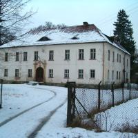 Ściana zachodnia pałacu w Milinie w 2019 roku. Widoczne na pierwszym planie granitowe schody. Filary zostały odbudowane późną wiosną 2017 roku, po tym, jak poprzednie stały się niestabilne i groziły przewróceniem. Kamienne głowice zostały zachowane z oryginalnych filarów.