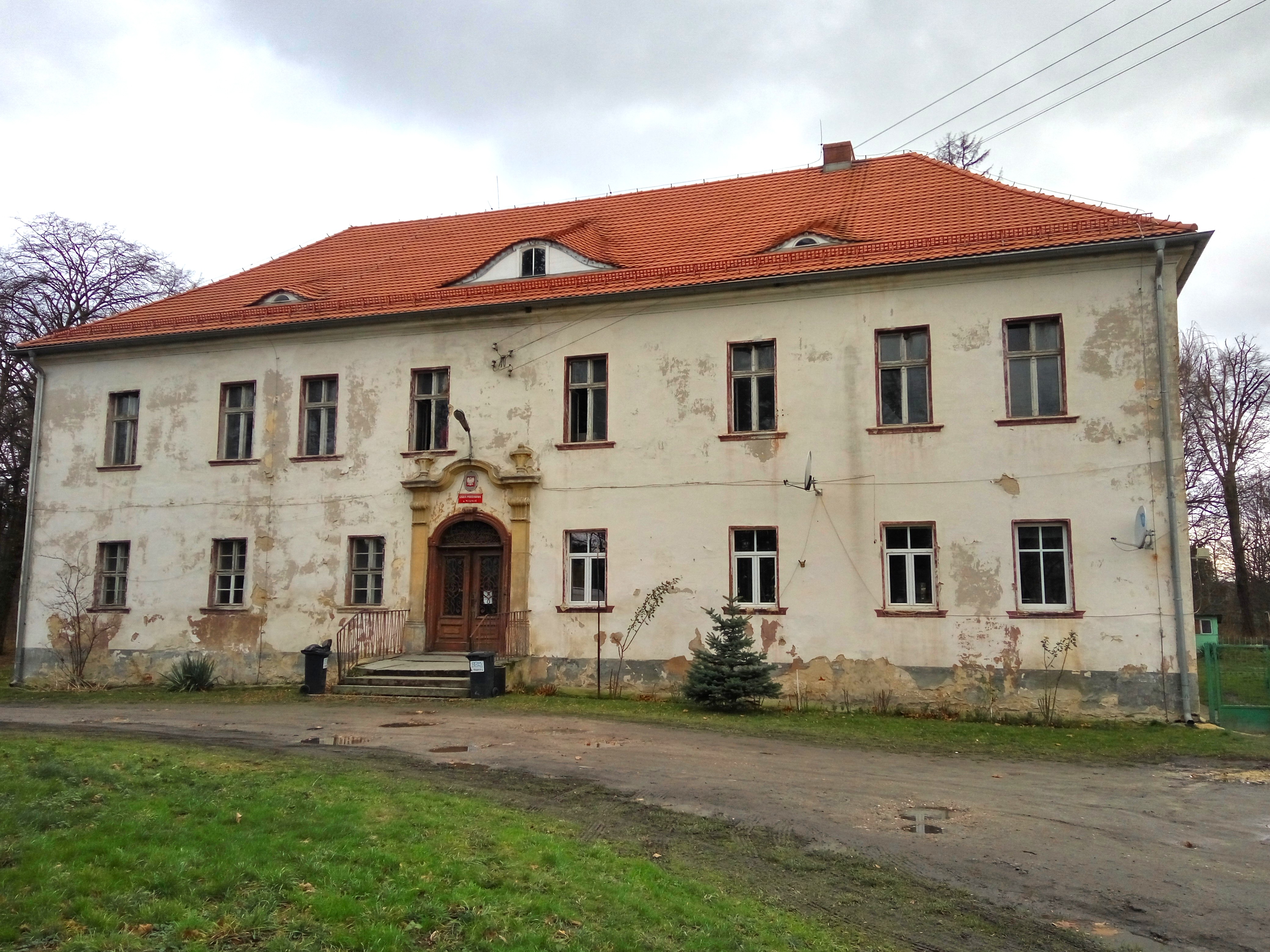 - Fasada frontowa (wschodnia) pałacu w Milinie w 2015 roku. W centralnej części ozdobny portal wejściowy z drzwiami. Elewacja z licznymi ubytkami odsłania kolejne kolory farby kryjącej wapienny tynk.