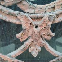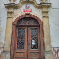 Dlaczego warto to zapamiętać: Zdjęcie posiada dużą wartość dokumentacyjną, ukazując architektoniczne rozwiązanie strefy wejściowej/tarasowej z masywnymi podporami. Rejestruje również ważny moment w historii budynku – fazę częściowego remontu. Zabezpieczono kluczowy element konstrukcyjny (nowy dach ceramiczny), podczas gdy elewacja i detale wciąż czekają na pilne prace konserwatorskie. Warto zwrócić uwagę na geometryczny wzór balustrad, różniący się stylistycznie od barokowego portalu głównego.