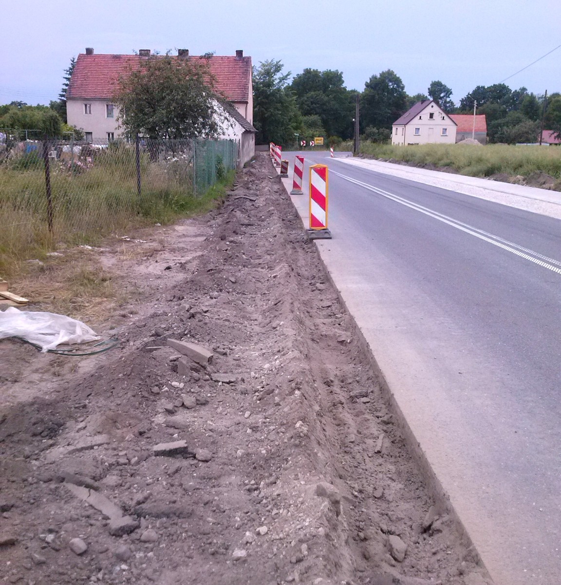 Na zdjęciu widać fragment ulicy Mietkowskiej w Milinie w czasie budowy chodnika. Ujęcie pokazuje przygotowanie terenu przed ułożeniem obrzeży i kostki brukowej. Na zdjęciu widać drogę powiatową do Mietkowa, a po lewej stronie dom przy Chłopskiej 1.