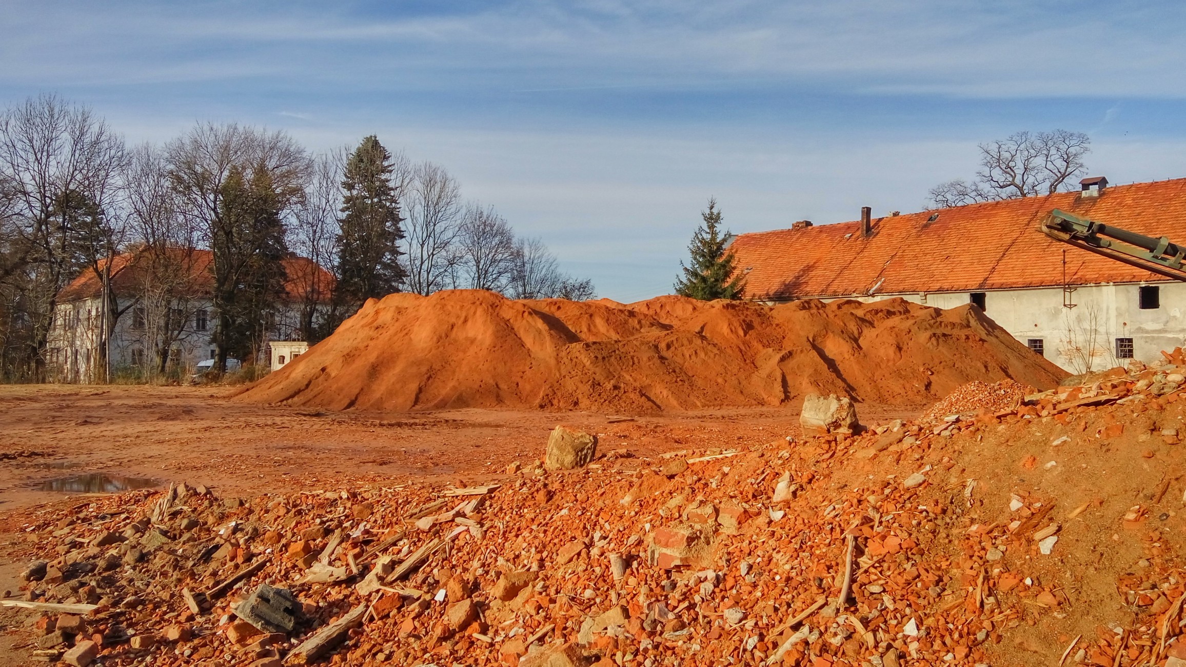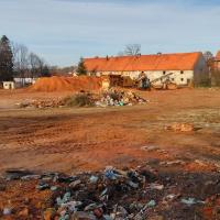 Zbliżenie na hałdę mączki ceglanej po budynkach dawnego folwarku przypałacowego, a później Rolniczej Spółdzielni Produkcyjnej w Milinie.