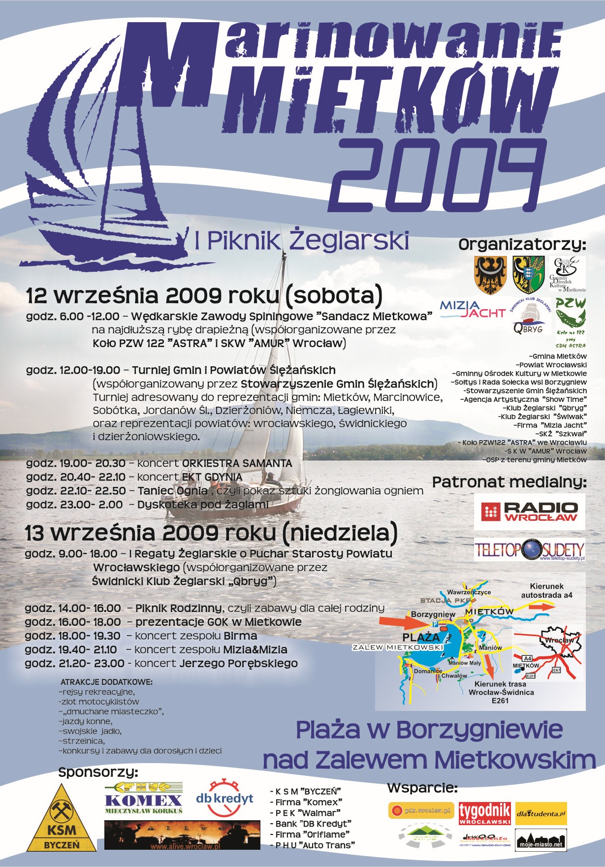 "Po raz pierwszy na terenie Gminy Mietków zorganizowaliśmy tak duże przedsięwzięcie mające na celu promocję Gminy Mietków, zbiornika mietkowskiego, którego obszar zajmuje ponad 900 ha, oraz budowy tzw. “mariny”, czyli wspólnego projektu ośrodka sportów wodnych. W organizację naszej dwudniowej imprezy, przy dużym wsparciu sponsorskim, zaangażowało się wiele podmiotów m.in: Starostwo Powiatowe we Wrocławiu, Gmina Mietków, Stowarzyszenie Gmin Ślężańskich LGD, Sołtys i Rada sołecka wsi Borzygniew, Kluby Żeglarskie “Qbryg”, “Szkwał” i “Świwag”, firma MiziaJacht, Agencja artystyczna “Show Time”, oraz OSP z terenu gminy.