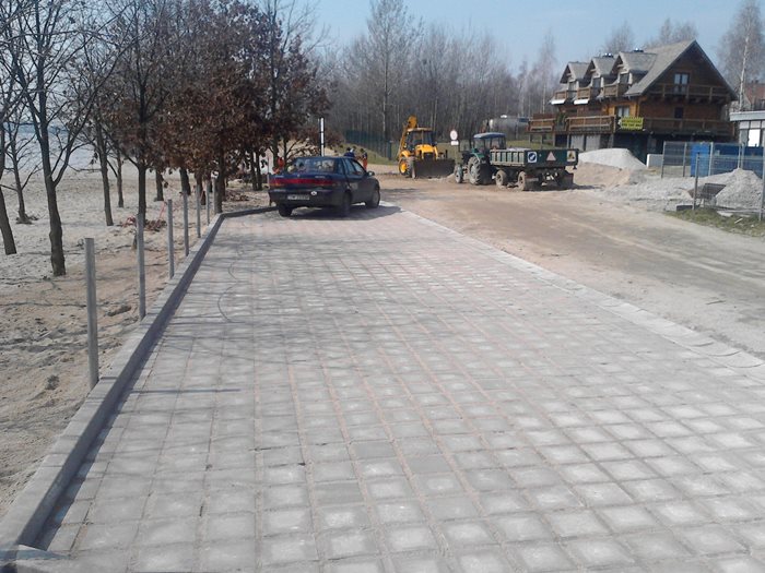 - Zdjęcie miejsc parkingowych przed wejściem do recepcji Ośrodka Sportów Wodnych w Borzygniewie zrobione w kwietniu 2013 roku. W tle widoczny charakterystyczny dom z bali, a po lewej fragment plaży.