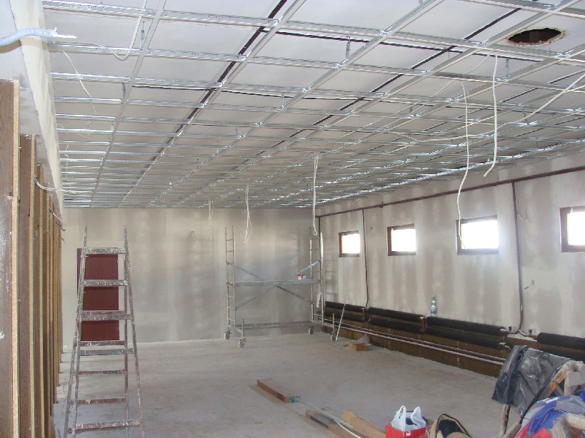 Gminny Ośrodek Kultury (GOK) w Mietkowie w trakcie szeroko zakrojonych prac remontowo-budowlanych. Widok remontu sali głównej, montowane stelaże sufitu podwieszanego i ścian gotowych ścian z karton-gipsu.